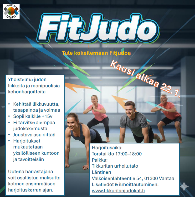 Tule kokeilemaan FitJudoa Yhdistelmä judon liikkeitä ja monipuolisia kehonharjoitteita - Kehittää liikkuvuutta, tasapainoa ja voimaa - Sopii kaikille +15v - Ei tarvitse aiempaa judokokemusta -…