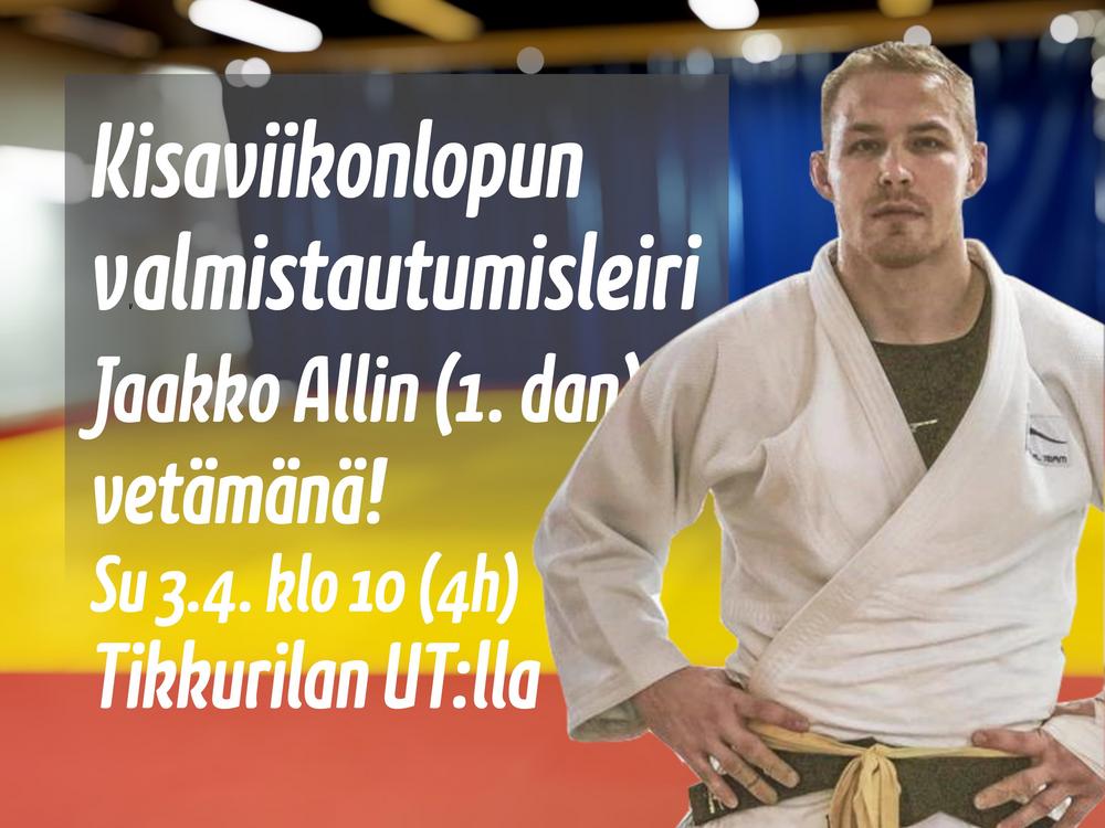 Seuramme entinen huippukilpailija Jaakko Alli (1. Dan) saapuu huhtikuun ensimmäisenä sunnuntaina vetämään tehokkaan 4h kestävän valmistautumisleirin 9.-10.4. kisaviikonloppuun osallistuville junioreille. Jaakko on mm. European Cup -mitalisti ja nelinkertainen MM-kisaedustaja.