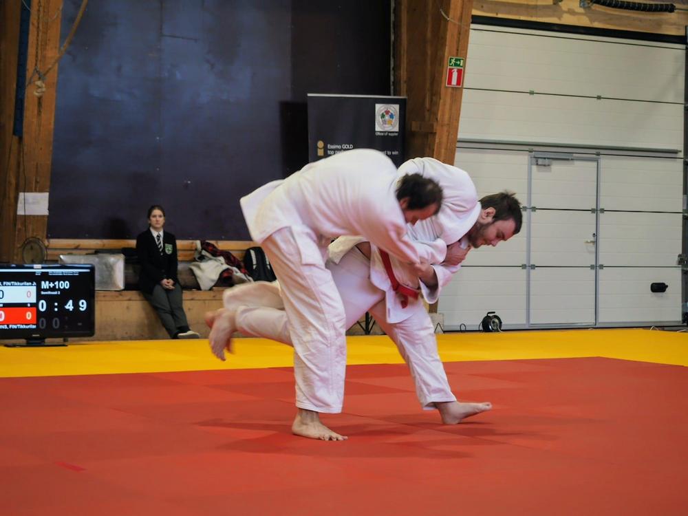 Tikkurilan miehet kohtasivat semifinaalissa ja kyllä jännitystä riittikin. Miehet taistelivat tuttuakin tutuimpien tekniikoiden viuhuessa. Yllättäen Akselin heitto sivalsi Henri nurin ja tuomarin käsi nousi pystyyn voiton merkiksi. Näin Akseli finaaliin ja Henrille pronssia. Finaaliin Akselia vastaan asteli ensimmäisen ottelunvoittaja Tommi Laine. Ottelu oli hyvin tasaväkistä puoli väliin saakka. Tommin osotogari-yritys päätyi Akselin mainioon vastaheittoon. +100 kg sarjan kultaa Akselille!