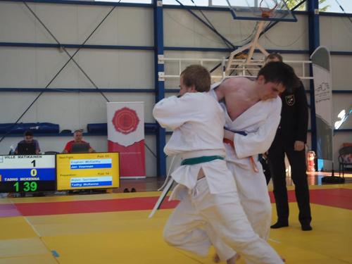 Kirkkonummen Joona Kaukonen esitteli kisatatamilla oivallisia tekniikoita. Maakaveri Kuopion Mikko Niskanen koki toimivan taiotoshin ottelun alkumetreillä. Kaukonen koki harmittavan tappion Irlannin Hardyn kääntäessä Kaukosen yrityksen toimivalla vastaheitolla itselleen. Siitä Kaukosen sisuuntui ja nappasi Hollannin Schoonhovenista jälleen napakalla taiotoshilla voiton. Niskanen taisteli niinikään hollantilaisen ja irlantilaisen kanssa, mutta tällä kertaa tuli tappio kummastakin ottelusta. Tässä sarjassa kävikin hauskasti, sillä Kaukosen, Hardyn ja Schoonhovenin keskinäiset ottelut menivät ristiin, joten lopulta päädyttiin jakamaan kolme kultaa ja hopea Niskaselle.